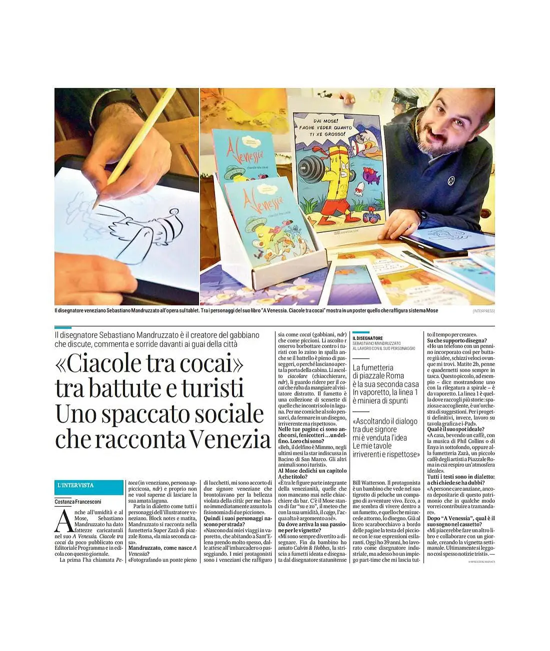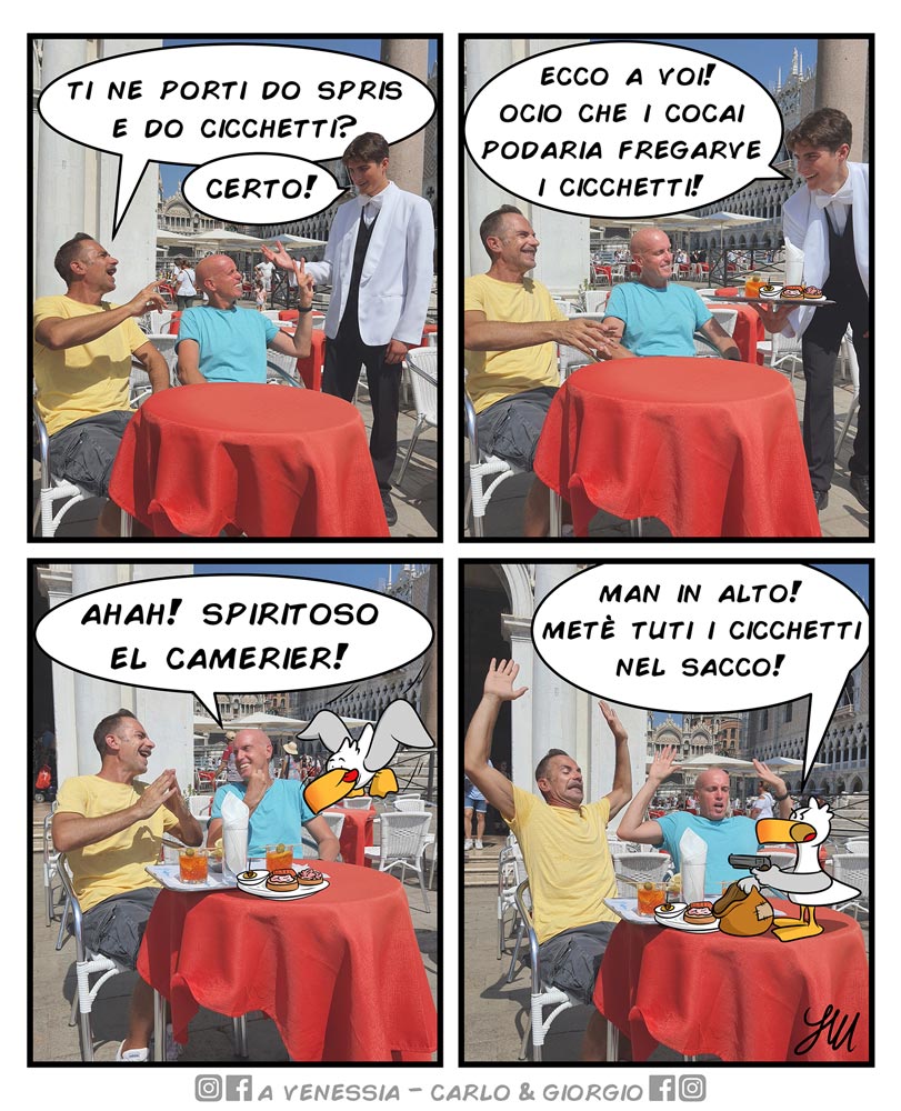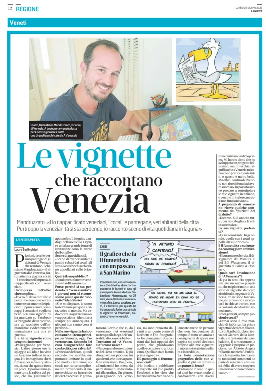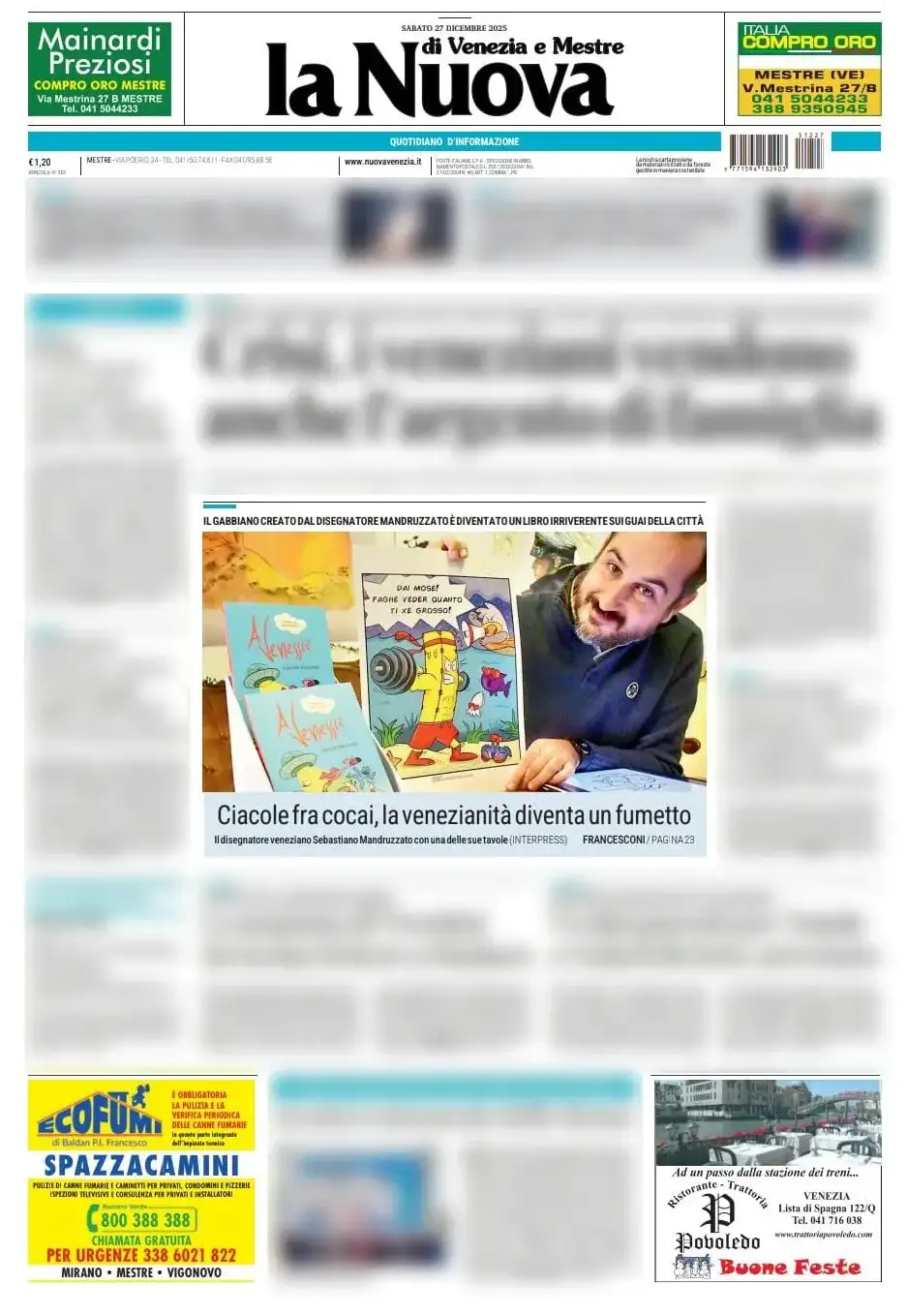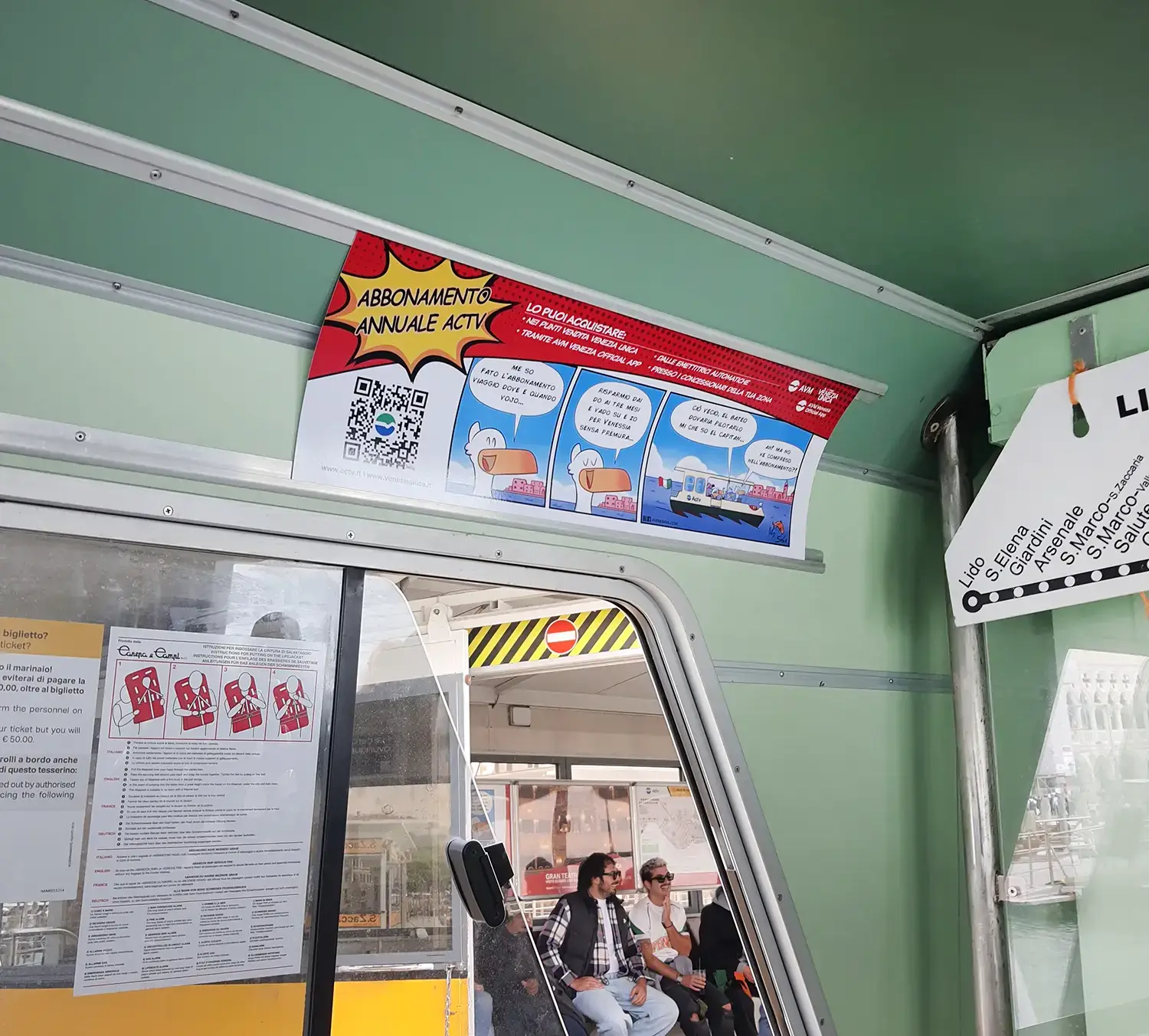 Il successo del progetto ha trovato recentemente conferma anche al di fuori dei social, grazie alla collaborazione con Actv (Azienda del Consorzio Trasporti Veneziano): oggi le mie illustrazioni compaiono sui pannelli informativi e negli spazi di attesa dei mezzi pubblici di Venezia e provincia, accompagnando residenti e visitatori nei loro spostamenti quotidiani. Un modo ulteriore per portare le “ciacole” di A Venessia tra la gente, là dove la città si vive ogni giorno. Ed è proprio da questa parola, così veneziana, che ho voluto intitolare il nuovo fumetto, “A Venessia – ciacole tra cocai”, edito Editoriale Programma e in vendita in tutte le librerie: una raccolta di alcune tra le vignette più riuscite pubblicate in questi anni.